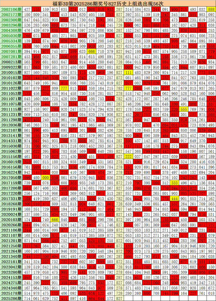 解密:最初,直选827开出之后,10期内开出豹子号0次,2003年-2025年在开出直选827之后,10期内组三累计出现52次,组三在异日第1-5期出现概率为94%,组三在异日5-10期出现的概率为88%。