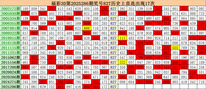 直选号码827历史上开出了17次,其下期诀别开出奖号:392、699、218、623、942、003、111、077、178、452、547、222、358、143、585、086。