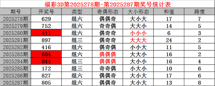 上期总结:福利彩票3D第2025287期开奖着力805。奖号:偶偶奇、大小大山西创达伟业电子科技有限公司,和值13,跨度8。