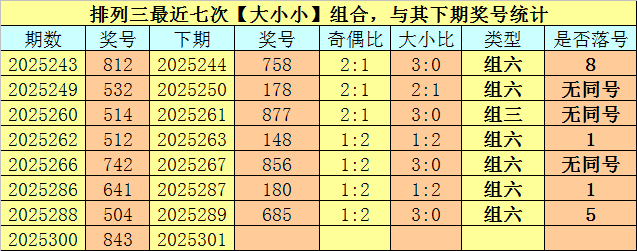 奖号类型分析:成列三最近七次【大小小】组合与【偶偶奇】组合出现之后,其下期组三号码开出1次,组六号码开出13次,其中组六号码开出频率相配热,本期展望无间开出组六号码。另外,其下期有5期莫得出现重号,本期不看好开出重号。