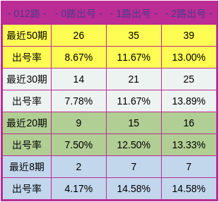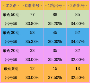 合座走势:通过50期数据对比看,2路较热,1路、0路开出率略低。