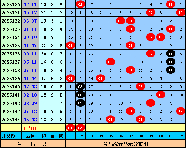 后区奖号分析:上期后区开出奖号05+08,奖号和值为13,跨度为3,本期瞻望后区和值转小,看重两码01 02。