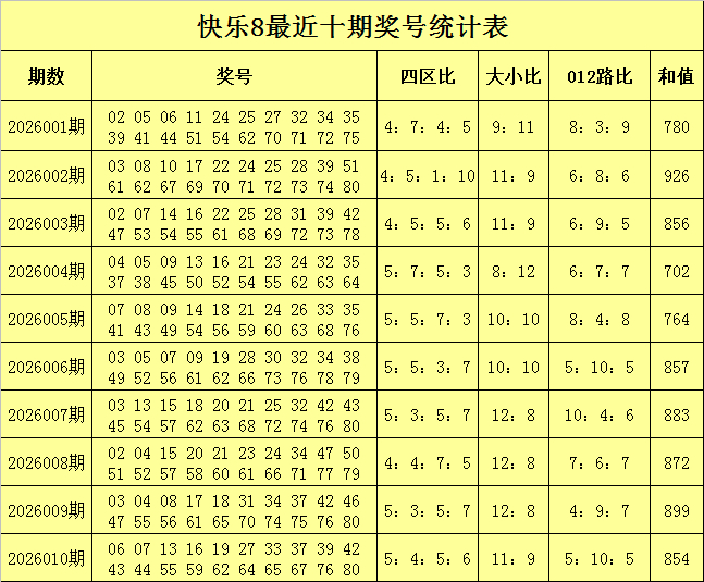 福彩精练8第2026010期开奖总结:06 07 13 16 19 27 33 37 39 42 43 44 55 59 62 64 65 67 76 80,其中奖号四区比为5:4:5:6。